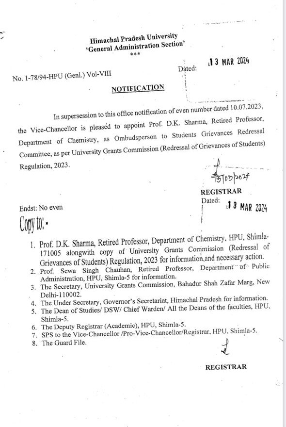 | Himachal Pradesh University Notification: Appointment of Ombudsperson for Student Grievance Redressal (UGC Regulations, 2023) |